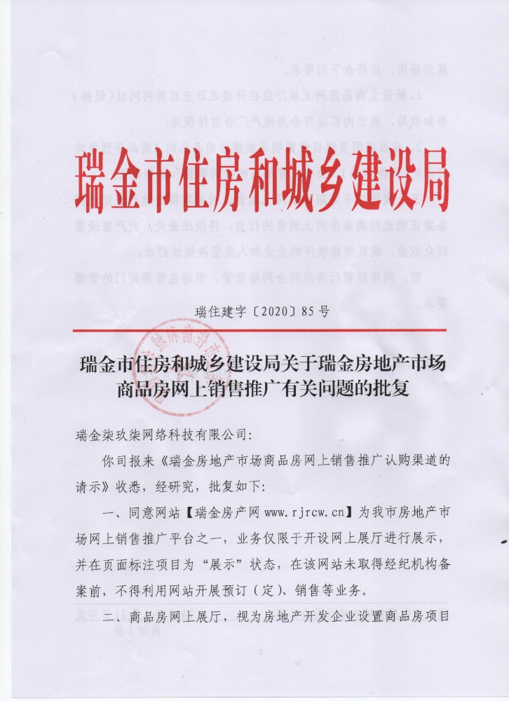 - 好消息~瑞金房產(chǎn)網(wǎng)商品房線上推廣銷售渠道獲瑞金住建局正式批復(fù)