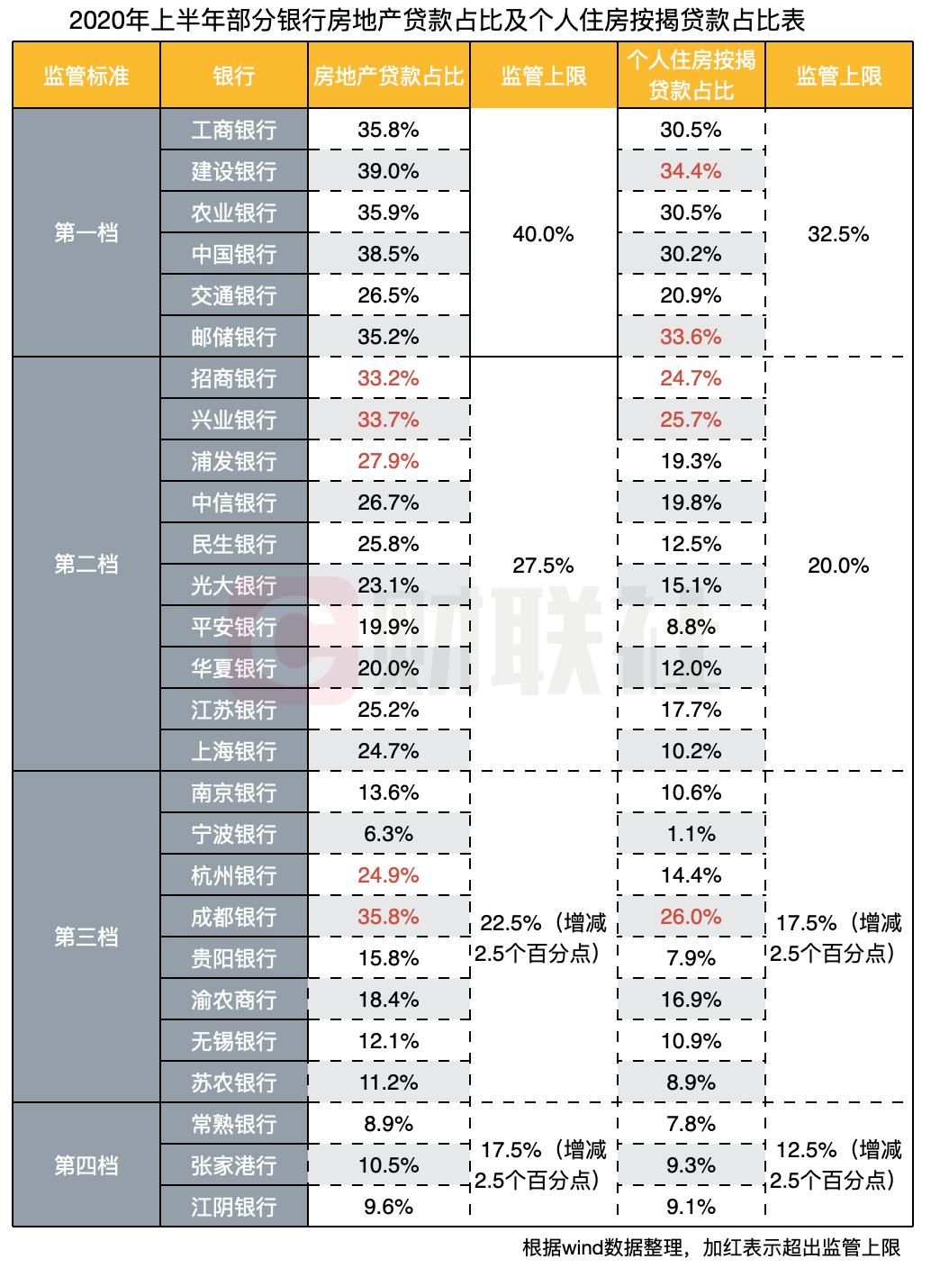 以第一檔的六大國有銀行為例,建行及郵儲銀行個人住房按揭貸款均超過了32.5%的紅線,而工行、農(nóng)行、中行的個人住房按揭貸款的占比也均超過30%。從房地產(chǎn)總體貸款占比來看,六大行中5家銀行均超過35%,1家占比達到39%,逼近40%的監(jiān)管紅線。而在第二檔當(dāng)中,招商銀行、興業(yè)銀行、浦發(fā)銀行等銀行的房地產(chǎn)貸款占比也紛紛踩線。