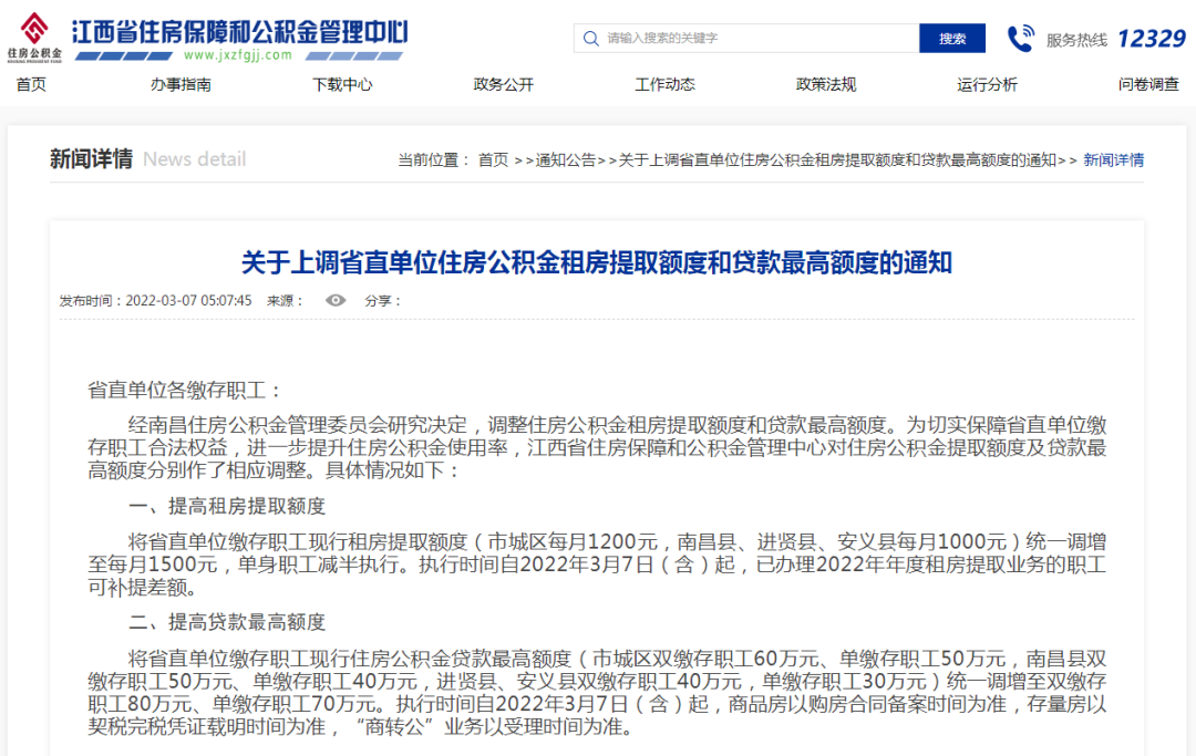 通知明確,將省直單位繳存職工現(xiàn)行租房提取額度(市城區(qū)每月1200元,南昌縣、進賢縣、安義縣每月1000元)統(tǒng)一調增至每月1500元,單身職工減半執(zhí)行。執(zhí)行時間自2022年3月7日(含)起,已辦理2022年年度租房提取業(yè)務的職工可補提差額?!?/p>