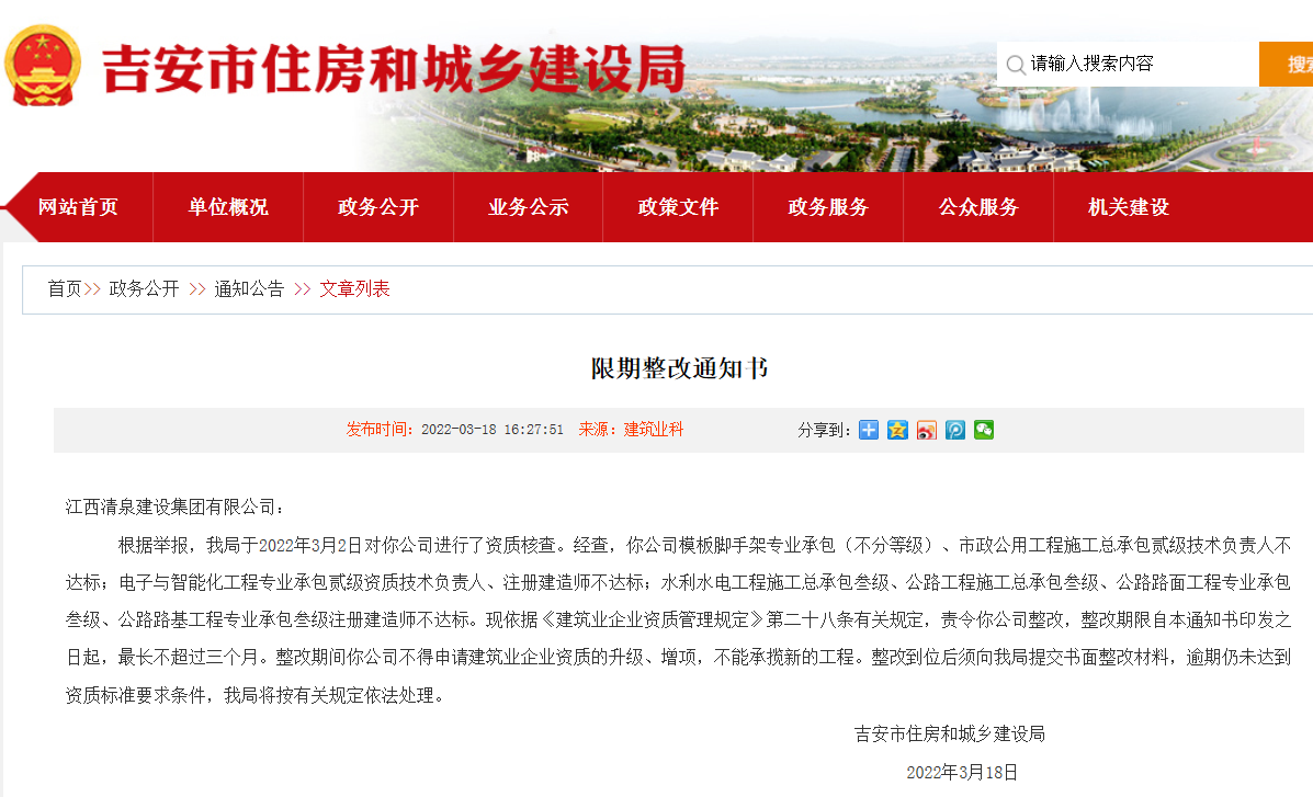 - 多項資質(zhì)不達(dá)標(biāo)!吉安市住建局責(zé)令江西清泉建設(shè)集團(tuán)限期整改