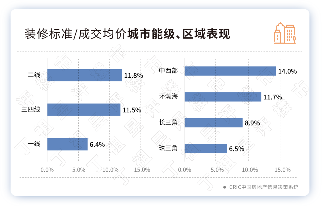 ??從區(qū)域表現(xiàn)來(lái)看,珠三角的裝修標(biāo)準(zhǔn)/成交均價(jià)為6.5%,裝修性?xún)r(jià)比較為良心。中西部區(qū)域裝修標(biāo)準(zhǔn)/成交均價(jià)比值達(dá)到14.0%,高于平均水平4各百分點(diǎn)。