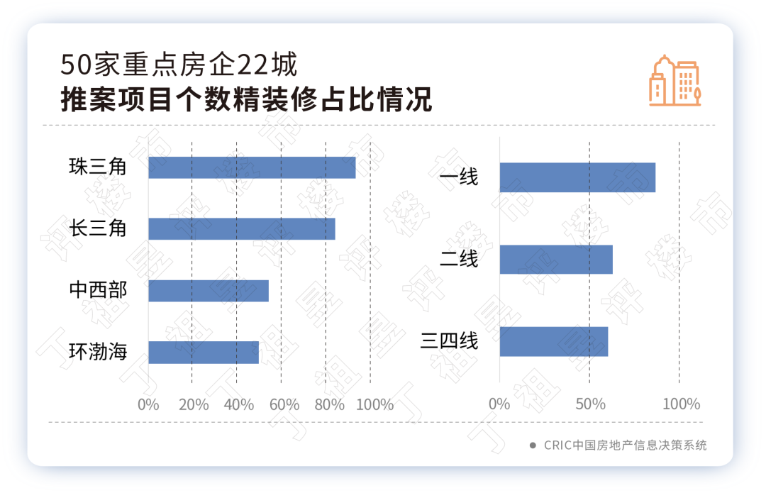 ??CRIC數(shù)據(jù)顯示,2021年1月-2022年6月期間,重點(diǎn)關(guān)注的50家房企在一線(xiàn)城市精裝修率達(dá)到了86%。